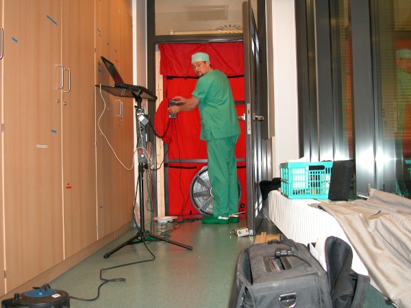eingesetzt. Die Blower Door ist ein Ventilator, der für die Messung in eine Außentür eingebaut wird und im Haus einen Unter- oder Überdruck erzeugt. Alles, was beispielsweise bei einem Unterdruck in das Haus strömt, muss an undichten Stellen eintreten. Wird im Haus jedoch ein Überdruck erzeugt und ein ungiftiger Theaternebel versprüht, kann man außen am Haus deutlich sehen, wo die fehlerhaften, undichten Stellen liegen.